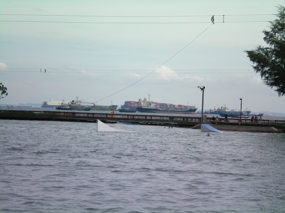 On est descendu du bus devant un lac appelé East Cost Lagoon réservé au ski nautique tracté par des cables. C'est aussi brutal que le tire fesse en montagne.