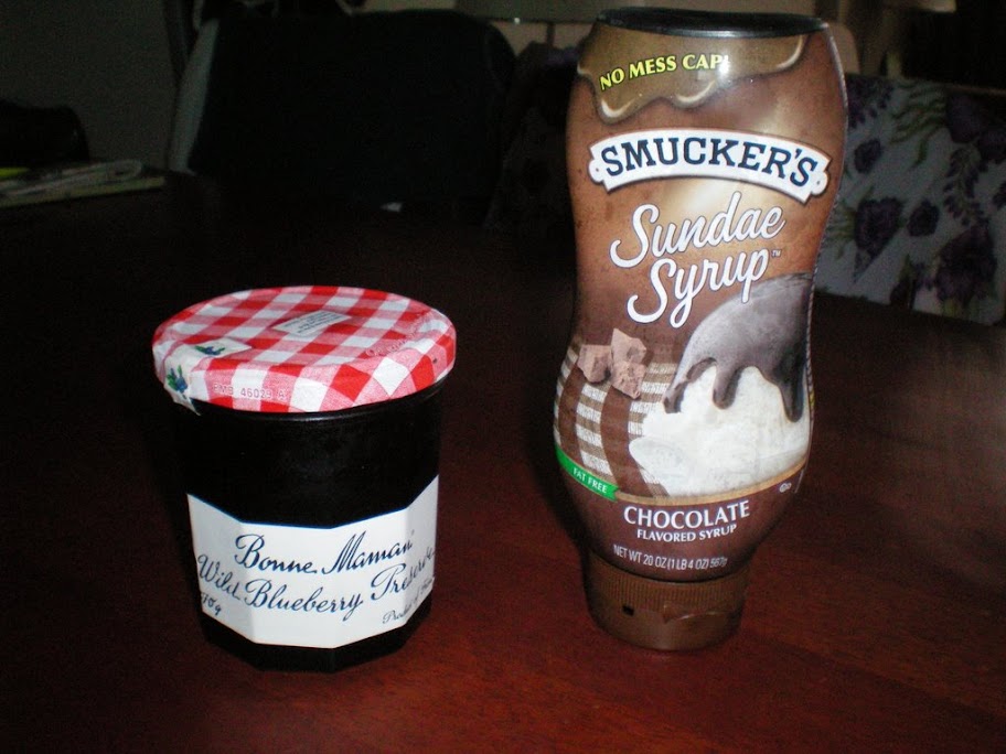 Biensûr on allait pas les manger nature. Avec de la confiture de myrtille sauvage et du coulis de chocolat, c'est meilleur.